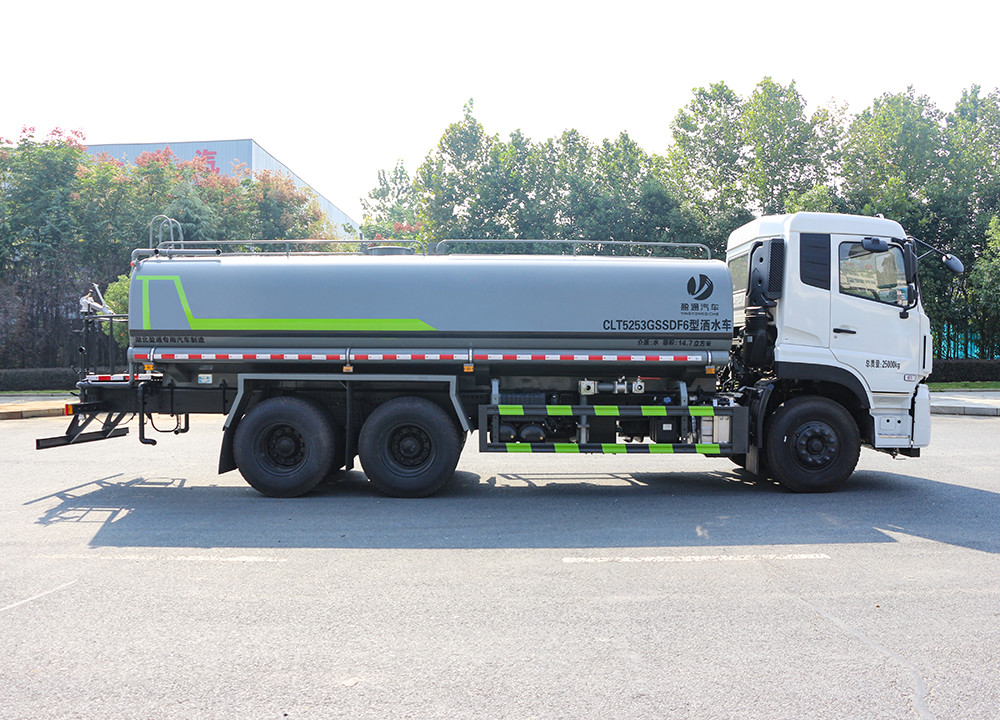 東風天龍20噸灑水車整車型號 CLT5253GSSDF6 型灑水車 2 發動機型號 D6.7NS6B290 3 發動機馬力/功率 康明斯 290 馬力/213KW 4 發動機排量 6700ML 5 變速箱 大同 7 檔變速箱 6 輪胎規格 295 真空胎 7 軸距 4350+1350 8 總質量 25000KG 9 整備質量 10800KG 10 額定載質量 14070KG 11 整車尺寸(長×寬×高) 10*2.5*3.2 12 罐體容積 18.3 方 13 燃料種類 柴油 14 排放標準 國六 15 水泵型號 60/90 16 罐體材質 Q235 碳鋼.產品功能 前沖鴨嘴 后灑 后對沖 高炮 高位花灑 側噴
