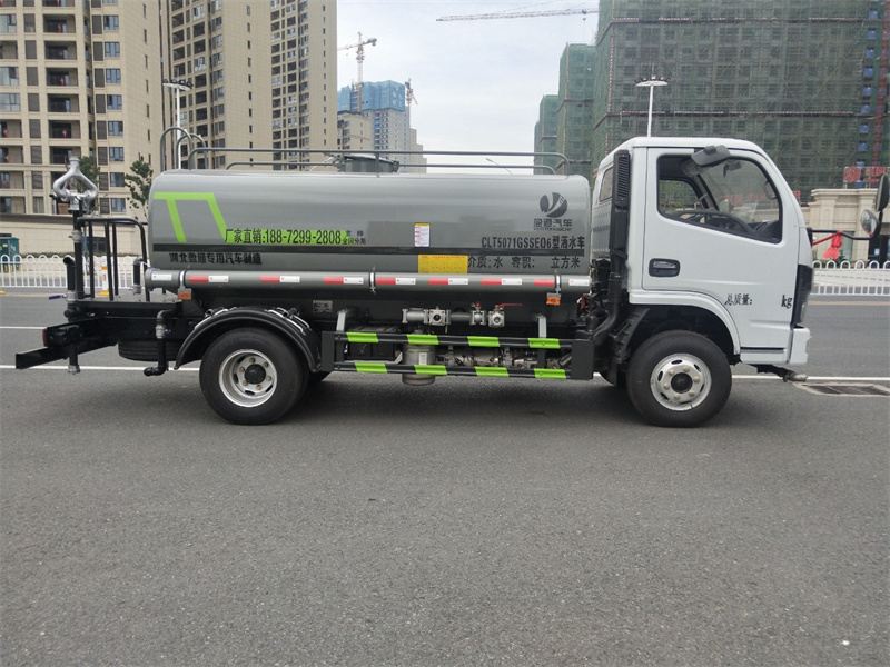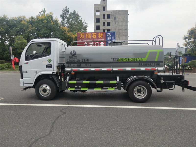 東風5噸灑水車產品主要技術參數 序號 名稱 型號、規格 1 整車型號 CLT5071GSSEQ6 型灑水車 2 發動機型號 CA4DB1-11E6 3 發動機馬力/功率 錫柴 110 馬力/81KW 4 發動機排量 2207ML 5 變速箱 萬里揚 5 檔 6 輪胎規格 7.00 鋼絲胎 7 軸距 3308 8 總質量 7360KG 9 整備質量 3220KG 10 額定載質量 4010KG 11 整車尺寸(長×寬×高) 6.15*1.99*2.4 12 罐體容積 5 方 13 燃料種類 柴油 14 排放標準 國六 15 水泵型號 40/50 16 罐體材質 Q235 碳鋼