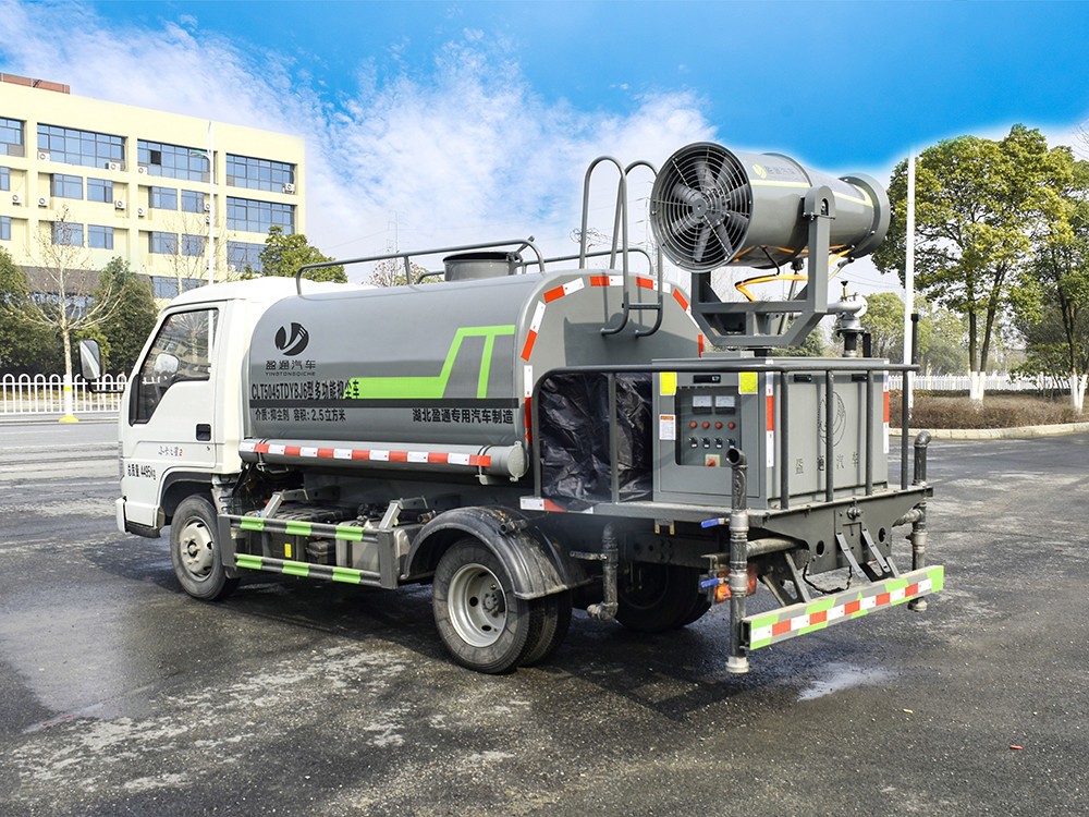 3方霧炮灑水車 整車型號 CLT5045TDYBJ6 型多功能抑塵車 2 發動機型號 Q23-95C60 3 發動機馬力/功率 全柴 95 馬力/70KW 4 發動機排量 2300ML 5 變速箱 蒙沃 5 檔箱 6 輪胎規格 6.00 鋼絲胎 7 軸距 2600 8 總質量 4495KG 9 整備質量 2700KG 10 額定載質量 1665KG 11 整車尺寸(長×寬×高) 5.365*1.9*2.6 12 罐體容積 2.7 方 13 燃料種類 柴油 14 排放標準 國六 15 水泵型號 40/50 16 罐體材質 Q235 碳鋼產品功能展示 霧炮 后灑 后對沖 高炮 側噴