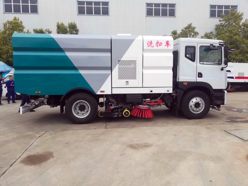 1)該車集掃路車、灑水車和高壓清洗車功能于一體,具備路面清掃、路面洗刷、高壓清洗、低壓沖洗、路緣石洗刷、垃圾收集、污水回收、噴霧降塵和道路隔離墻清洗、小廣告清洗等多種作業功能。
