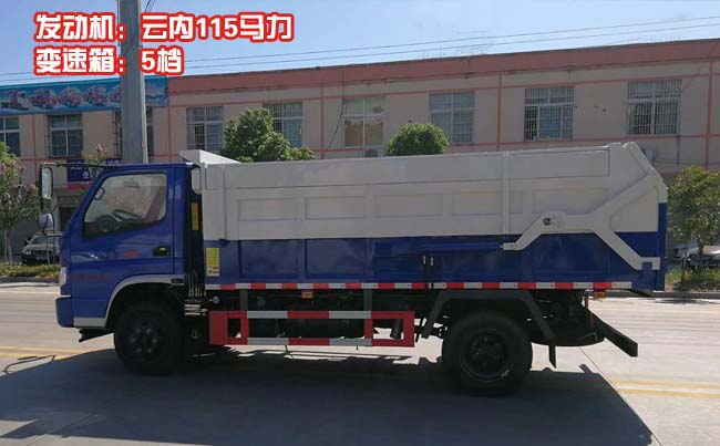 時風藍牌對接式垃圾車,時風風順純工程車底盤,云內115馬力發動機,5檔帶副變速箱,軸距3280mm,雙層大梁,7.00R16輪胎,帶方向助力,ABS。