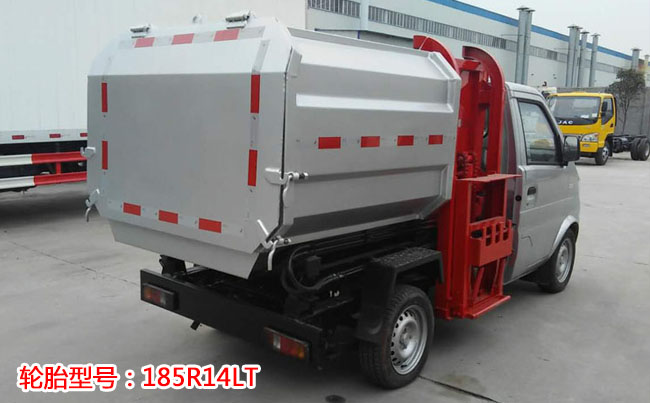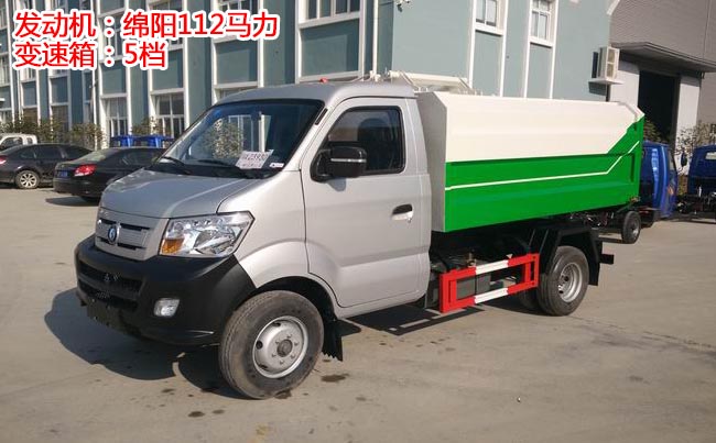 重汽王牌掛桶式垃圾車,1650單排駕駛室,綿陽112馬力汽油發動機,5檔變速箱,185R14LT輪胎型號,140大梁,3噸后橋、油剎。