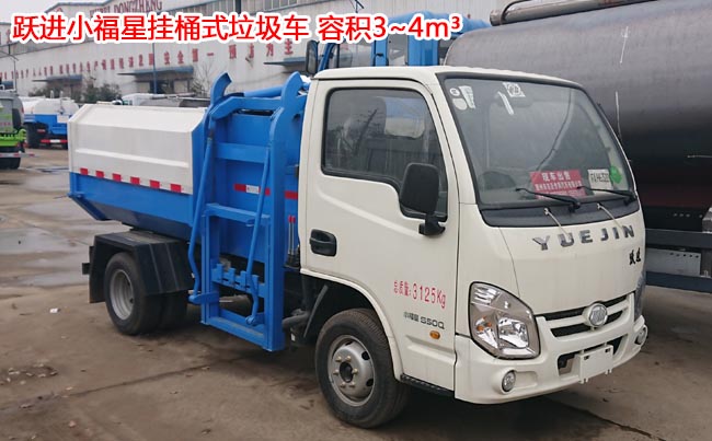 躍進小福星掛桶式垃圾車,南京躍進底盤,柳機88馬力發動機,5檔變速箱,軸距2.65米,185R14后雙輪輪胎,帶前盤制動,選裝空調,方向助力。