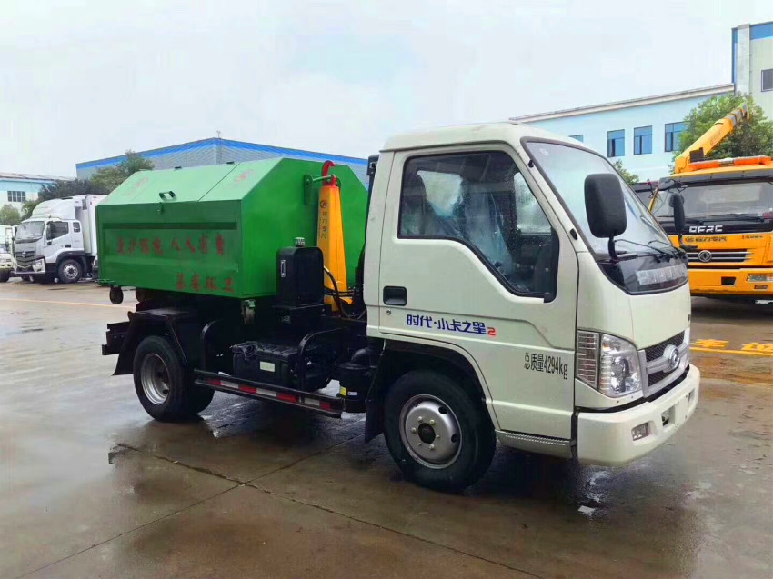 福田勾臂式垃圾車基本詳情采用福田微卡車身,2600mm軸距,福田正宗國五),5檔變速箱,油剎,2噸后橋,175R14LT輪胎,獨懸大梁,帶整套燃氣系統,標配電子助力。外形尺寸4280×1600×1900(mm)。采用國標碳鋼3mm板材制作,采用武鋼產Q235-A型。 帶電磁取力,齒輪泵,液壓油缸,廂體兩側開門,帶液壓撐桿,后門帶密封條,帶鎖緊裝置,四角帶滾動輪,可自卸。采用好質量油漆,車廂外部做防銹處理,車身油漆為白色,垃圾箱為上白下藍。福田小型垃圾車