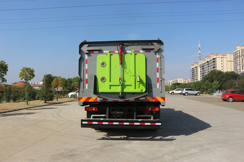 Ø 清水箱充分利用了車載空間,容積大,容積達9m3。垃圾箱采用單層304不銹鋼結構,傾翻卸料,帶高壓自潔裝置。自潔裝置可在垃圾箱卸料時幫助卸料,清洗垃圾箱內部。