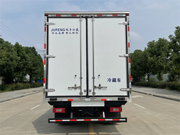 奧鈴排半5米2冷藏車廂體配置為:斷橋隔溫工藝,整體結構框架,內外面料為3mm新款啞光玻璃鋼夾保溫層真空復合而成,廂體厚度為8cm,最新款鋁合金包邊型材,型材局部厚度為4mm(鋼制鉚釘加固),廂體內部采用2個LED照明燈及廂體示寬燈,后門框不銹鋼材質,門框密封條為三元乙丙橡膠材質,加厚型不銹鋼合頁及鎖件;副梁為Q700車用大梁鋼,15mm厚大梁墊皮,加裝防撞膠塊,不銹鋼門鎖件,配后雙開門,副駕駛一側居中靠前開單側門一個,帶2個排水孔。