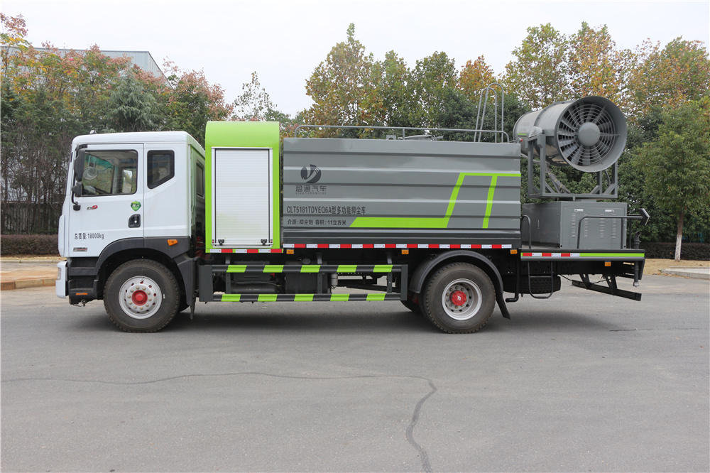 多功能抑塵車 產品主要技術資料 產品名稱: 多功能抑塵車 外型尺寸(mm): 8680×2500,2550×3800,3900 底盤型號: EQ1185LJ9CDE 貨廂尺寸(mm): 3400×2450×1580 總 質 量 :(kg) 18000 接近/離去角(° ) 17/13,19/13 額定質量:(kg) 8970,8905,8070,8005,7470,7405 前懸/后懸(mm): 1260/2920 整備質量:(kg) 8900,9800,10400(Kg) 高車速(km/h): 105 排放標準: 國六 底盤參數 底盤型號: EQ1185LJ9CDE 軸荷: 6500/11500 軸 數: 2 燃油種類: 柴油 軸 距(mm): 4500 前 輪 距(mm): 1862,1933,1949 駕駛室乘人數: 2,3 后 輪 距(mm): 1806,1865 輪 胎 數: 6 彈簧片數: 8/10+7,8/- 輪胎規格: 295/80R22.5 18PR,10.00R20 18PR,275/80R22.5 18PR 整車說明: 該車用途為抑塵降霾.主要裝置為罐體及噴霧裝置;隨底盤選裝駕駛室,選裝底盤附件位置;罐體有效容積:11立方米,罐體外形尺寸(長×長軸×短軸)(mm):3400×2450×1580,ABS系統生產廠家,型號 :焦作博瑞克控制技術有限公司,J ABS;襄陽東風隆誠機械有限責任公司,ABS/ASR-24V-4S/4M.側、后防護材料均為:Q235碳鋼,連接方式均為:螺栓連接,后部防護截面尺寸(mm):120×50,后部防護離地高度(mm):460.選裝罐體左右樣式,選裝噴霧裝置樣式。 發動機參數 發動機型號 發動機生產企業 排量(ml) 功率(kw) YCS04200-68