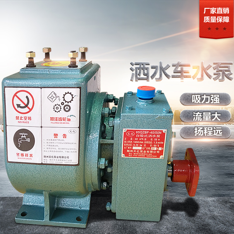 65QZ-40/45N灑水車水泵總成 型號:65QZ-40/45 灑水車水泵 流量:40m3/h 轉速:660轉/分鐘 揚程:45m 輸入軸轉速:1450n/min 軸功率:9.25KW 自吸高度:6.5m 自吸時間:1.5min/5m 輸入軸旋轉方向:左旋轉。灑水泵的工作原理:灑水泵工作時需要的動力直接由汽車發動機通過取力器提供機械動能,通過傳動軸來帶動灑水泵運轉。65QZ-40/45N灑水泵適配車型:東風車型、東風小霸王、東風福瑞卡、東風金霸、東風勁卡、東風之星、福田時代、祥瑞、賽瑞、福瑞、東風140長頭車、尖頭車、東風平頭車、齊頭車、140車型、玉柴車型、康明斯車型、解放車型、福田車型、江淮車型、江鈴、躍進、農用車等車型