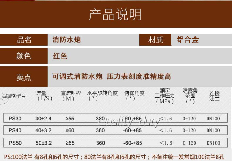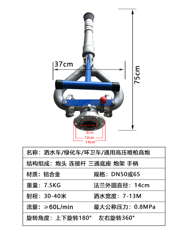 灑水車灑水炮的組成 灑水車灑水炮由五部分組成:炮頭、炮桿、水炮三通、法蘭,手柄。使用方法:用戶在使用時只需要打開管路閥門,調節水炮到所需要的噴灑狀態,站在灑水車的操作平臺上握住手柄,就可以輕松便捷的操作了。灑水車灑水炮適用范圍:廣泛用于東風140灑水車,東風145灑水車,東風153灑水車,東風天龍前四后八灑水車等各種灑水車。灑水炮性能:360旋轉,方向可旋轉,可調節到任意角度,可根據用戶要求上下左右自由調節。射程可達20-28m.可調節成水柱狀,大雨、中雨、毛毛雨、霧狀。