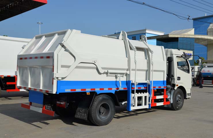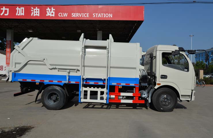 容積6~8立方米,箱體采用Q235碳鋼材質(zhì),箱體右側(cè)配液壓掛桶提升機,可掛國標(biāo)120升+240升塑料垃圾桶,駕駛室外部手動操作,鐵通掛架;后門鎖緊為機械鎖緊,手動開啟;相同結(jié)構(gòu)為槍版形式。