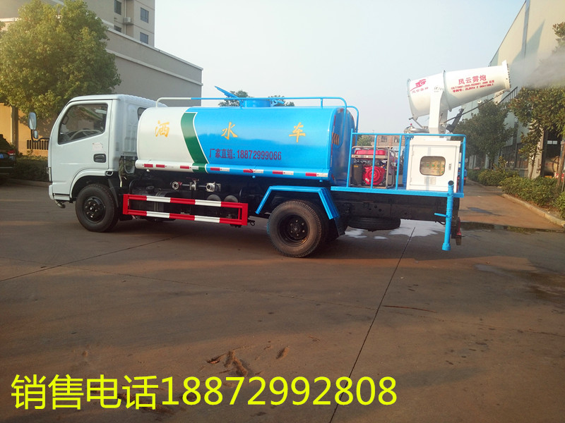 國六東風小多利卡帶霧炮5方灑水車采用 大功率水泵,灑水車前沖(噴)后灑,帶側噴,帶65消防接口,后平臺帶泡不帶門,前封頭帶水位計,后平臺主管路帶1寸澆花接口,后爬梯,配3米長抽水鋼絲塑料管兩根,用于抽水作業使用;罐后帶工作平臺,平臺上帶安全護欄,裝高位綠化灑水炮一個,灑水炮可全方位360度旋轉,可連續調成直沖狀、大雨、小雨、毛毛雨等不同噴灑方式,調成直沖狀射程長度≥28m、高度≥12m,調成細雨狀射程寬度≥15m;后工作平臺下用槽鋼連接焊有5mm厚保險杠,提高灑水車的主動安全性,泵可自吸自排,安裝過濾網,帶消防接口,可通過消防栓進水,帶自流閥,隨車選裝20米綠化卷盤,可噴灑農藥