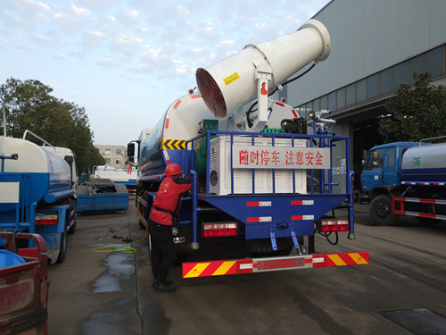 霧炮車,也叫抑塵車,工作效率約為普通灑水車的30倍。水箱中的水經過霧化后,由高壓風機噴出。相比普通灑水車噴出的水流,水霧顆粒極為細小,達到了微米級,其吸附力也增加了3倍,耗水量卻降低了70%,遭遇霧霾天氣、空氣質量PM2.5嚴重超標時,可隨意選定一個區域進行液霧降塵、分解淡化空氣中的顆粒濃度、將飄浮在空氣中的污染顆粒物、塵埃等迅速逼降地面,達到清潔凈化空氣的效果。