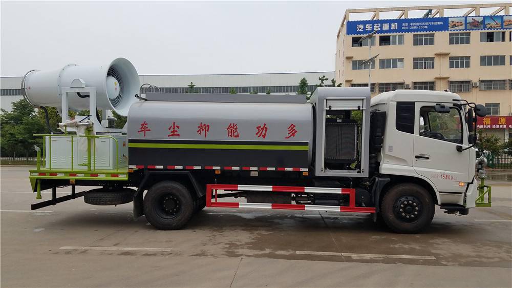 噴霧降塵車主要采用東風底盤研發改裝,上裝分為霧炮、機組、水罐罐體三大部分,依靠環保霧炮上高速運轉的風機風送原理,把罐體內的水霧化風送到60-160米遠的射程,適合風沙抑塵、工地降塵、拆遷降塵,專門用于城市開發區建設工地、拆遷工地、車站儲煤場、洗煤廠、焦化廠、鐵礦、鋼廠、港口等的揚塵風沙控制。