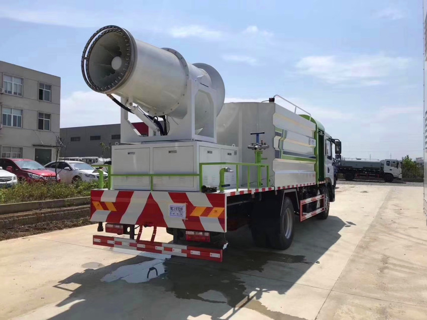 灑水車吸程≧7米,灑水寬度≧14-16米,射程≧25-30米,引水時間<5min,流量60m3/h。前沖(噴)、后灑、帶側噴(花灑)、帶后工作平臺、平臺上安裝綠化灑水高炮(炮噴射形狀可調節:直沖、大雨、中雨、毛毛雨、霧狀、可連續調節,360°旋轉),配消防接口,自流閥,濾網,帶自吸自排功能。配備大功率專用灑水泵,泵可自吸自排,安裝過濾網,帶消防接口,可通過消防栓進水,帶自流閥,此車尾部帶大功率噴霧炮,霧炮射程可選裝50-100米,帶獨立柴油發電機組。