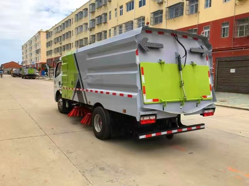 我公司生產的掃路車采用品牌二類底盤改裝,副發動機為日本五十鈴技術的柴油發動機或美國康明斯技術的柴油發動機,清掃裝置及吸嘴布置方式采用“中置四盤刷—后置吸嘴”的結構布置形式,副發動機與風機采用離心式自動離合器連接,能保證副發動機空載啟動;清掃裝置具有遇障自動避讓保護功能和自動復位功能。掃盤遇到障礙物后自動回縮,該功能有效地解決了清掃裝置易碰損的問題。全浮動吸嘴,具有清掃寬度大,清掃效率高的特點,并有利于清掃裝置與吸嘴的調整和維護。垃圾箱內膽采用雙層結構,內層為全不銹鋼;掃盤上部裝有不銹鋼噴霧降塵系統,有效地降低了揚塵帶來的二次污染;車箱前部設有手壓泵自動應急系統;尾部有 LED 箭頭燈警示裝置;開、關垃圾箱門及垃圾傾倒都可在駕駛室內操作,安全、方便、可靠。該掃路車具有清掃速度快、揚塵小、能耗低等特點,廣泛用于城市道路、公路、機場、碼頭、橋梁、廣場、小區的機械化清掃作業。