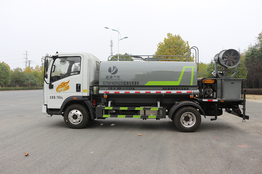 藍牌東風多利卡抑塵灑水車罐體容積為4-5m3,采用專用灑水泵可實現自吸自排。 前沖,后灑,側噴,后工作平臺帶綠化灑水炮,炮噴射形狀可調節:直沖,大雨,中雨,毛毛雨,霧狀,可連續調節,360度旋轉,配消防接口,自流閥,濾網,音樂喇叭,視水管,配兩根輸水管。加裝30型柴油噴霧機。