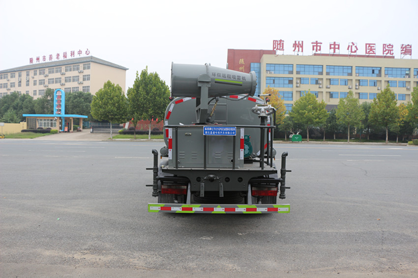 灑水車標配的4項噴灑頭:三彎前沖、后灑、鴨嘴側噴、高壓水炮,每一個噴頭均帶獨立的管道球閥以控制噴頭的開啟與關閉。灑水噴頭開的越多,水流量越大,水的壓力就被分散,道路沖洗效果就會相應降低,這也是有些環衛灑水車只采用一個前沖頭進行道路灑水的原因。另外,灑水車管道內水的壓力越大,水流量自然也會加大。