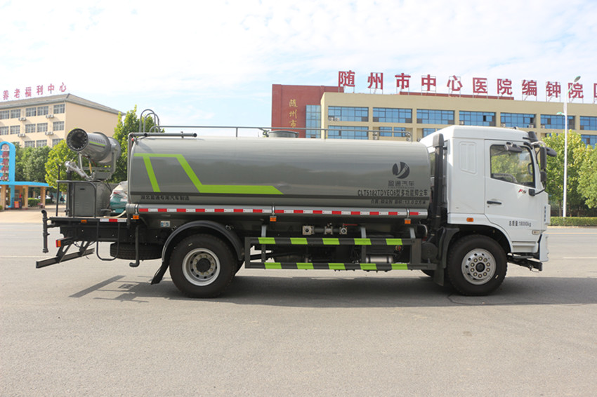 15噸灑水車罐體用4MM碳鋼板制作,罐內隔板具有防波作用,以減低汽車行駛時罐體液體的沖擊。整車帶一個專用灑水泵(垂直吸程7米),灑水寬度14米,射程28米。多功能灑水車配備2個前沖(噴)(能將路面泥巴、塵土、垃圾沖干凈);2個后灑(能均勻地將水灑在路面,一次灑水寬度14米)、2個側噴(花灑)(能均勻地將路旁綠化帶澆灌)、帶1個后工作平臺,平臺上安裝1個綠化灑水高炮(灑水炮可全方位旋轉,可連續調成直沖狀、大雨、小雨、毛毛雨,霧狀可調節沖洗高大樹木),引水時間<5min,流量60m3/h。帶1個消防接頭,帶1個自流閥,1個過濾裝置、人性化爬梯及側防護欄,安裝灑水音樂喇叭