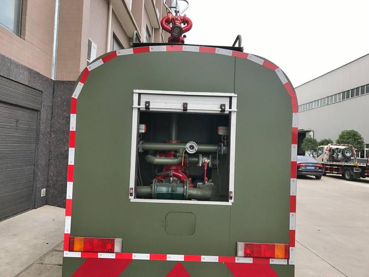 越野灑水車水罐體上裝配置:罐體采用碳鋼Q235板材,板材厚度4mm,罐體容積10-12立方,安裝全功率夾心取力器,CB10/40型消防水泵,帶PS40消防水炮一個,射程大于55米,后置工作泵箱,消防栓接口左右各一個,駕駛室頂部安裝長條警燈帶喊話器,全車顏色軍綠,兩側噴涂白色森林消防字樣。